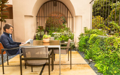 Green walls provide privacy and frame the setting for an urban oasis. Ferns and strawberries compete for dominance in a free-standing garden green wall composed of perforated steel.