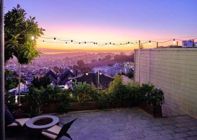 New access stairs from street level give way to the lower garden: a new deck nestled under the cantilevered house, basalt-paver sun patio with fire pit, a secret fern grotto, and more.