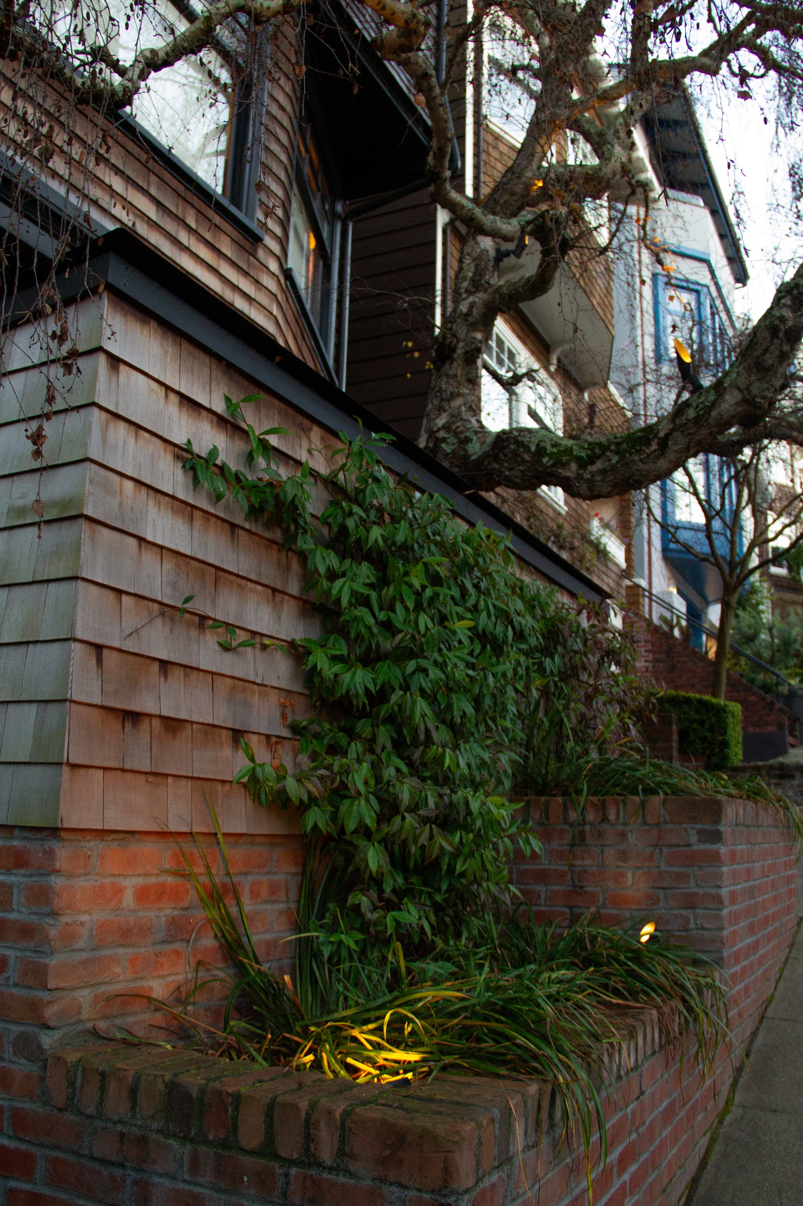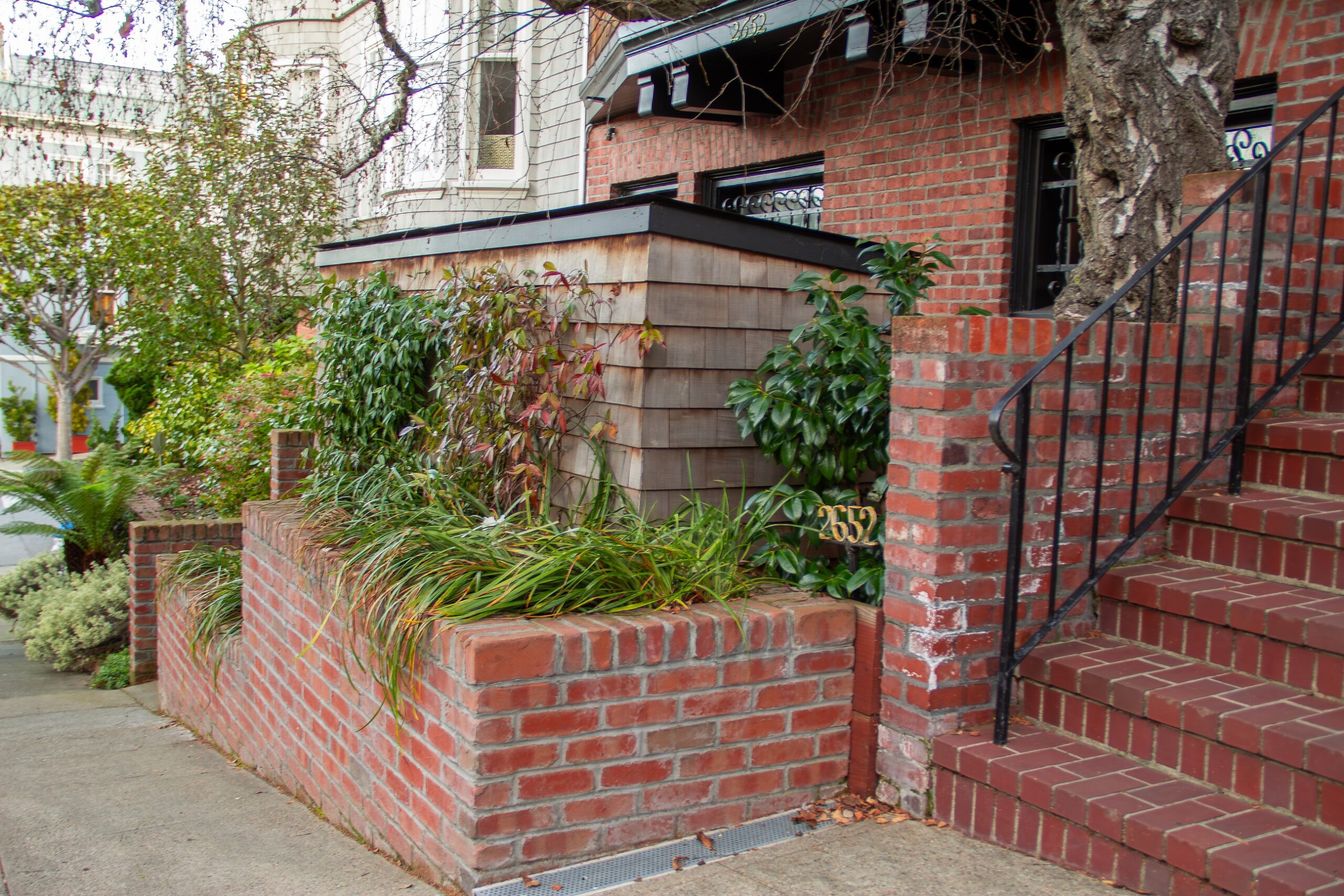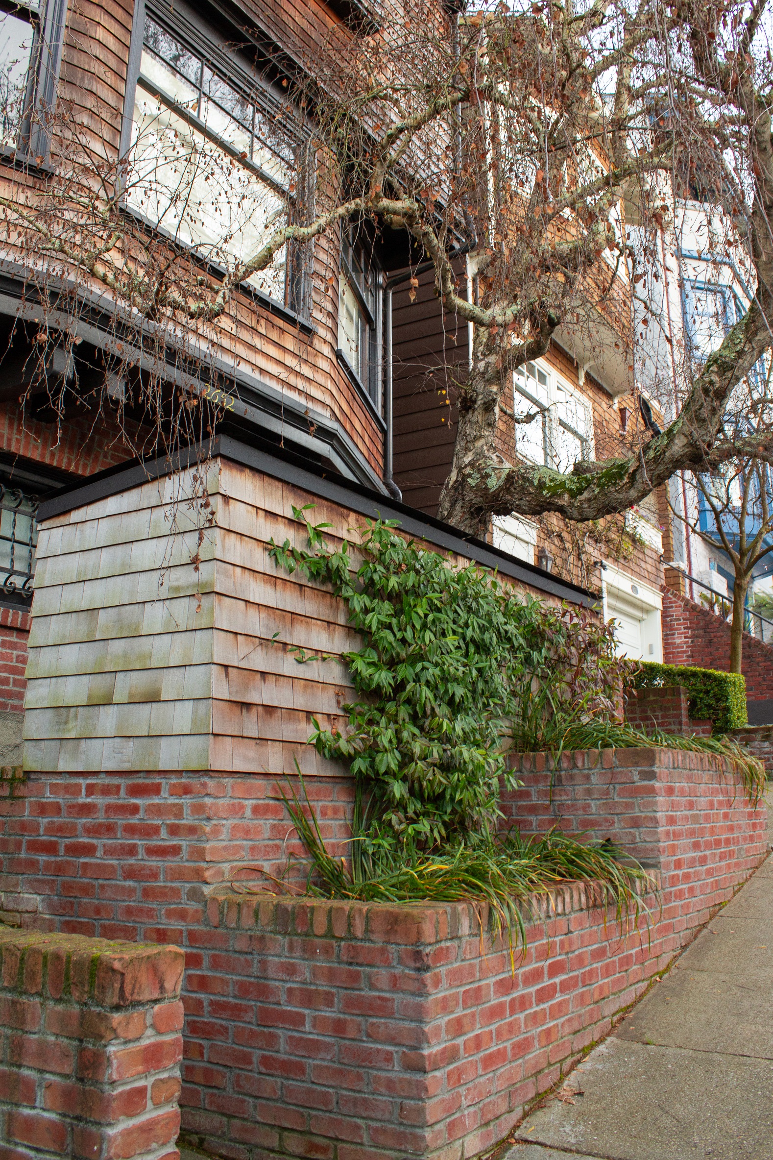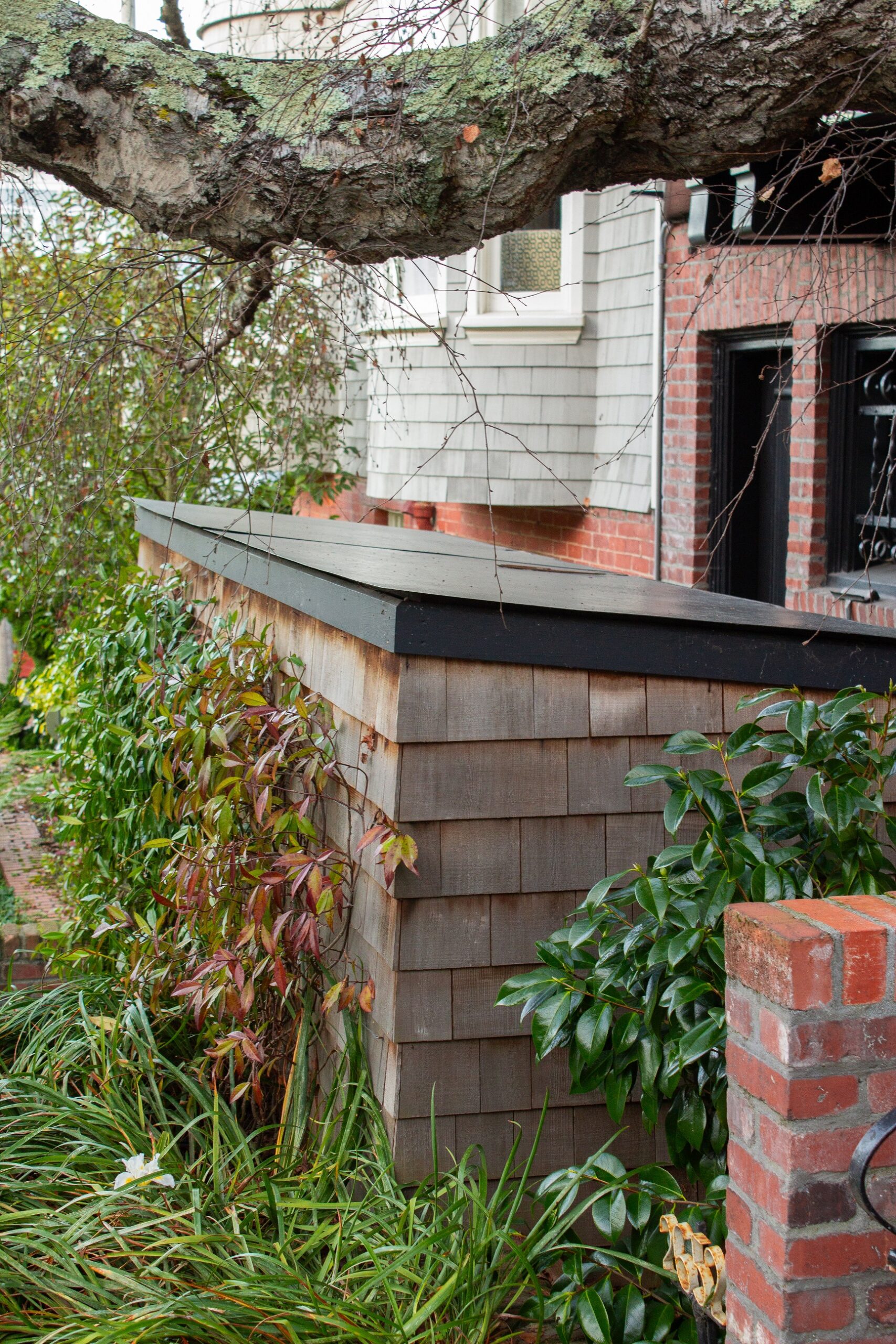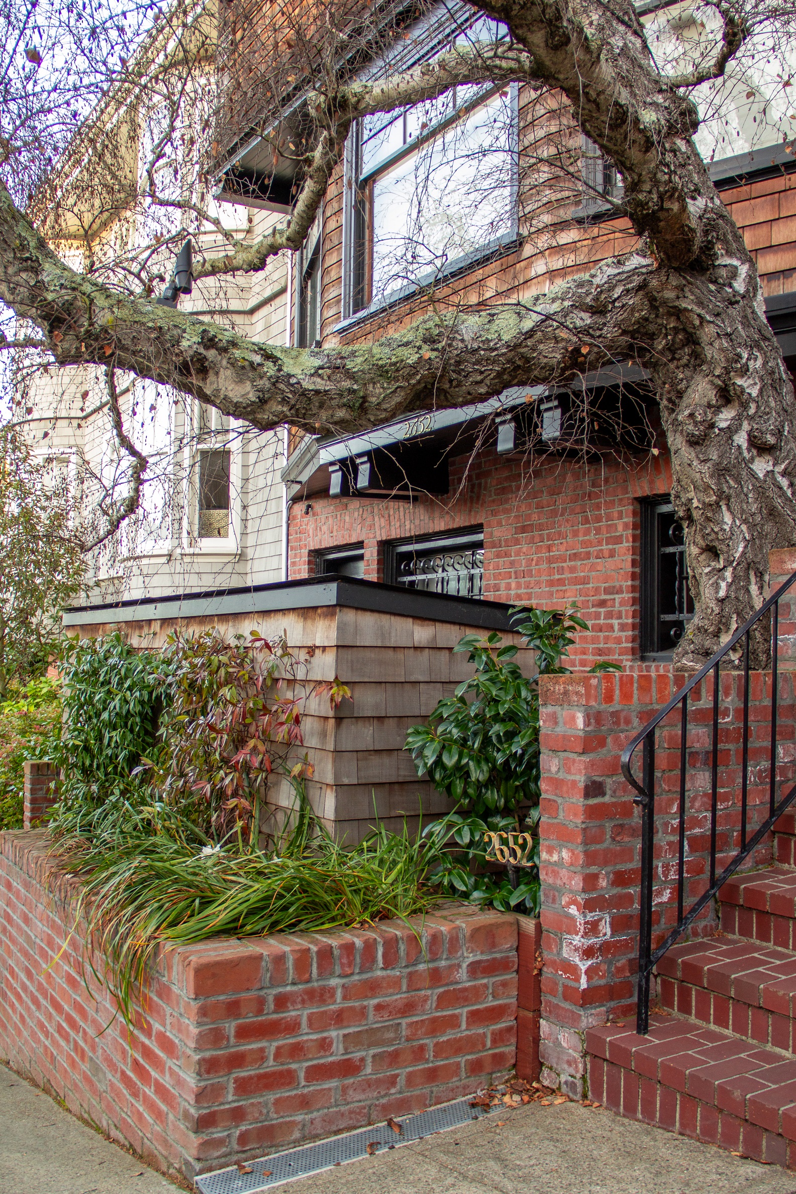 Creative brickwork fronting a 100-year-old house with custom bike shed and family heritage tree as focal point.