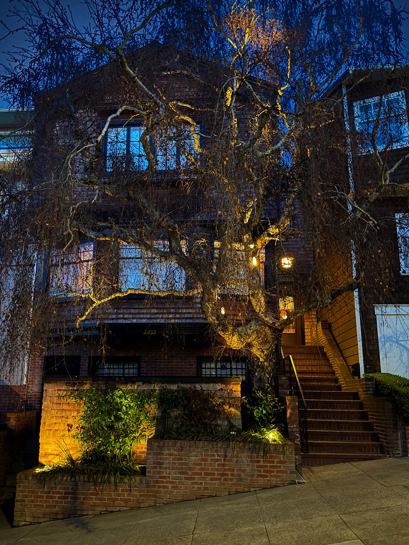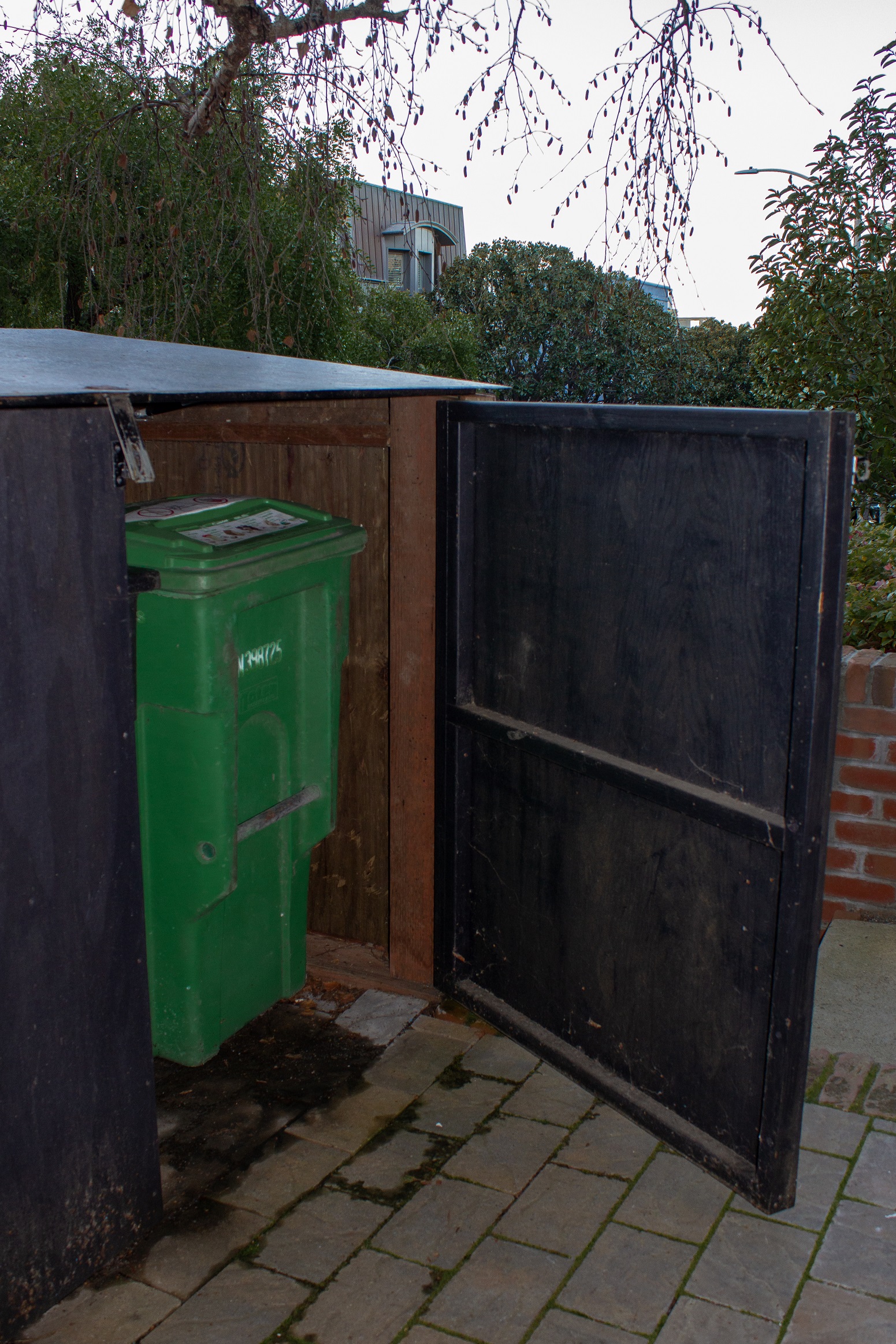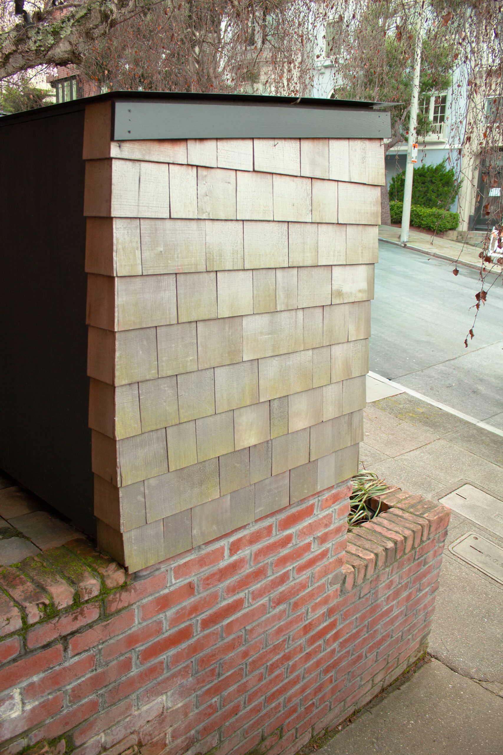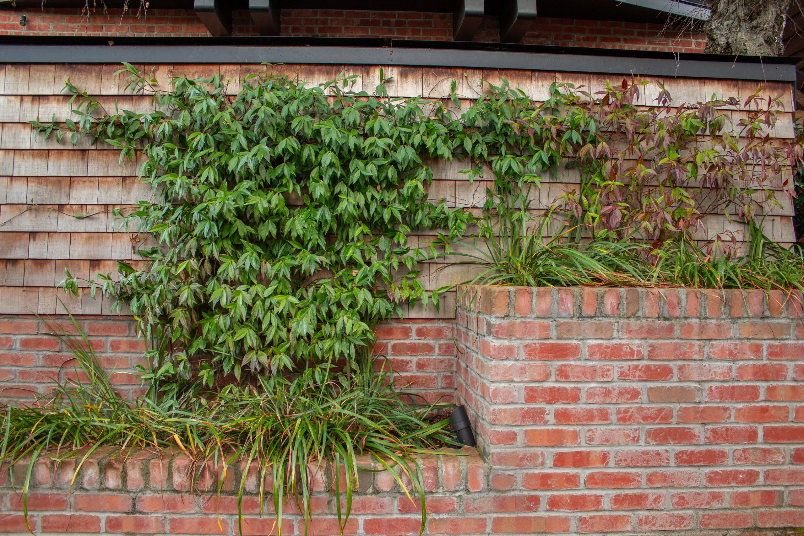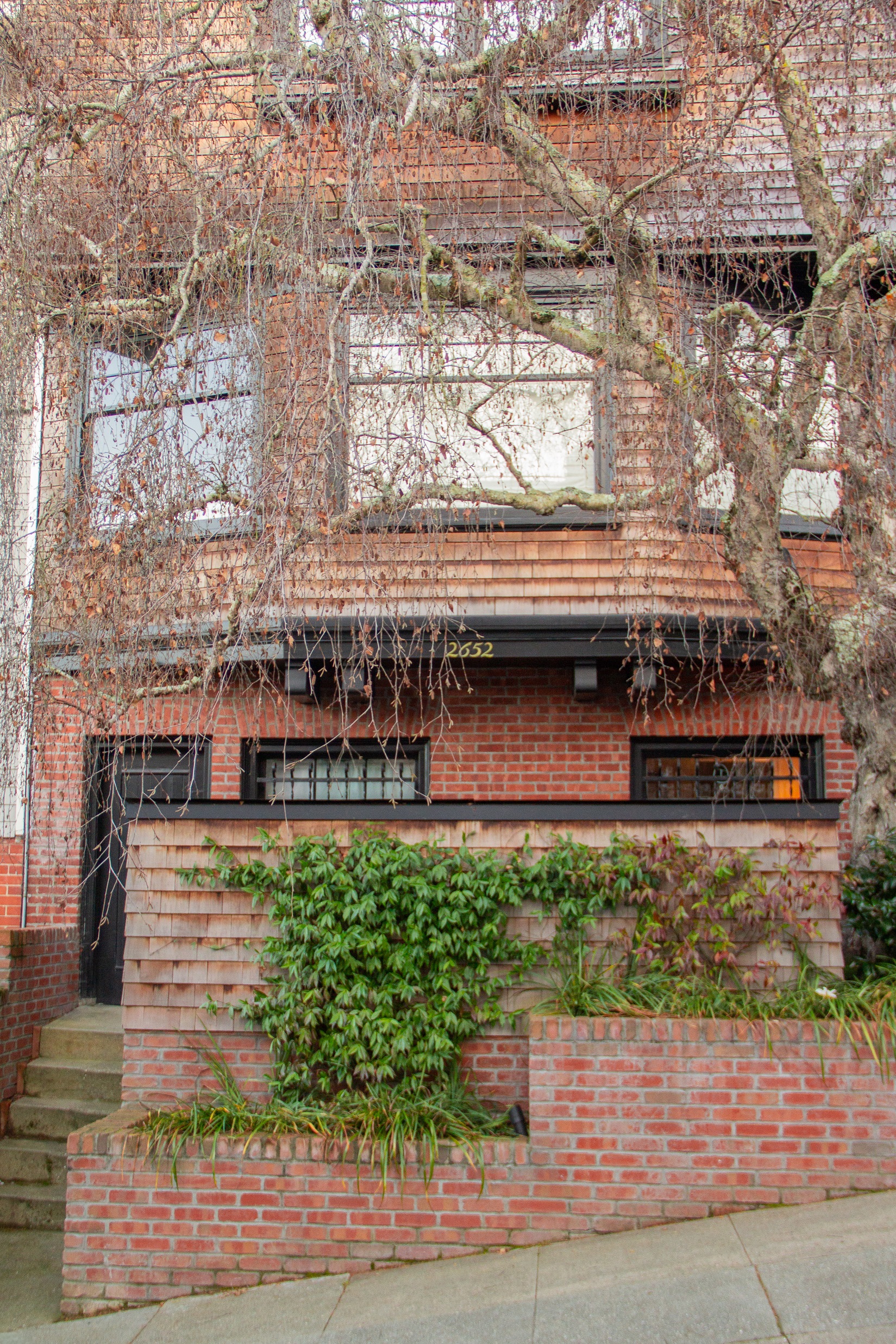 Creative brickwork fronting a 100-year-old house with custom bike shed and family heritage tree as focal point.