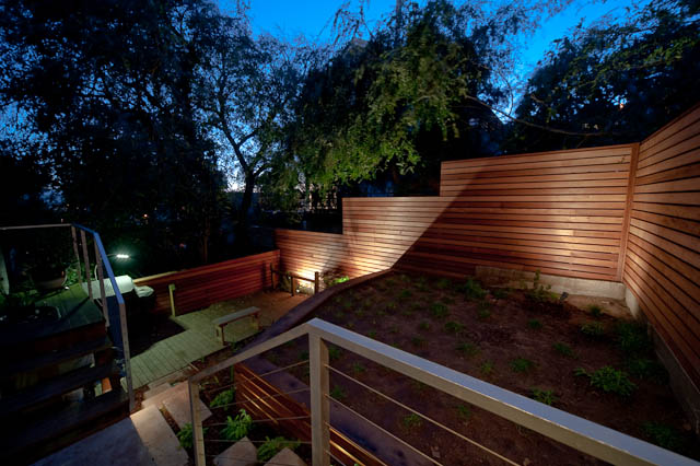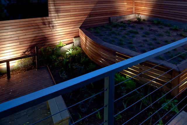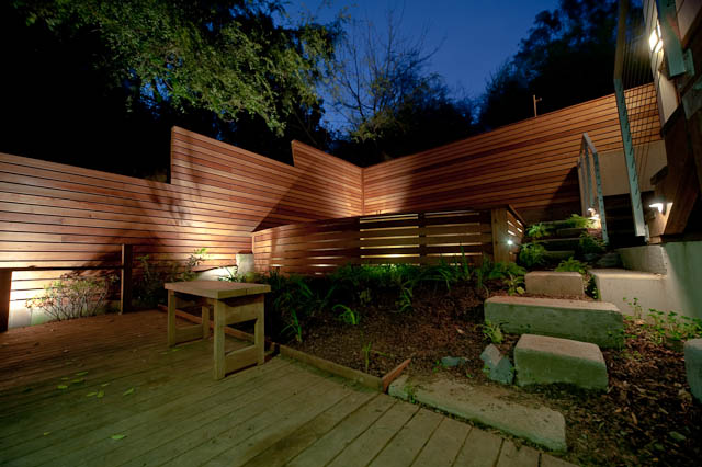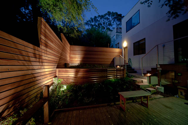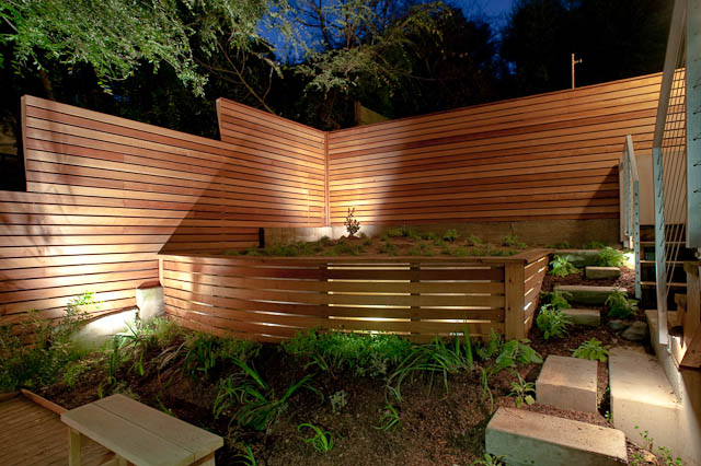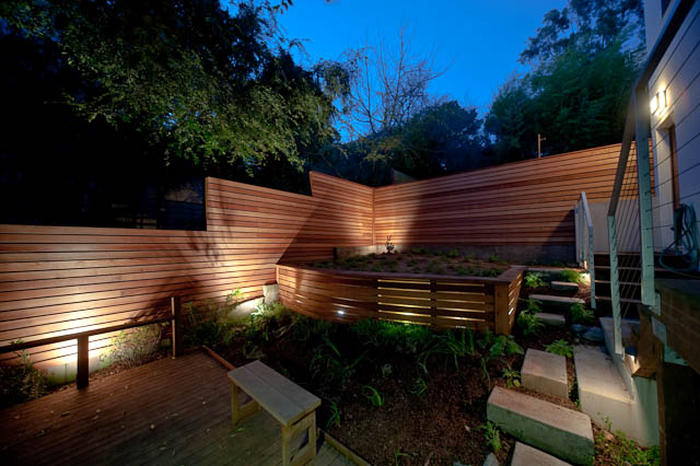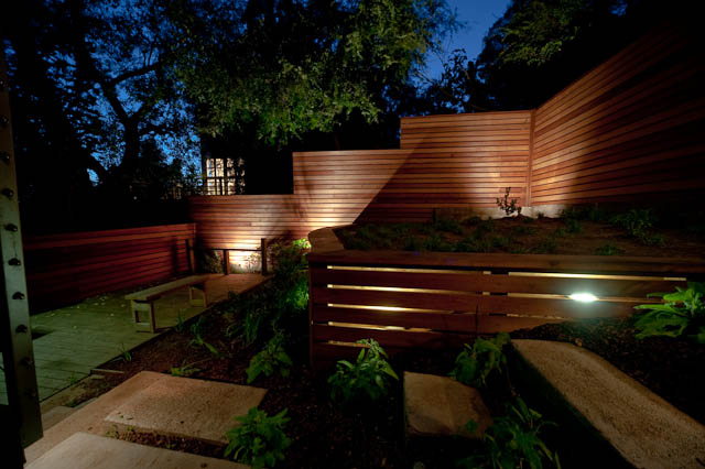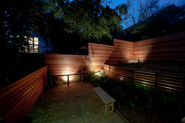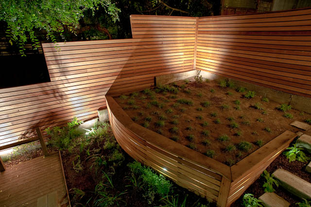 Small city garden comes alive at night with light-washed redwood fences and curved retaining walls lit from within.